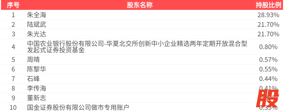 公司股东户数为3325户,前十大股东持股数量为3459.79万股,占总股本比例为75.83%同花证券,前十大股东持股情况如下: