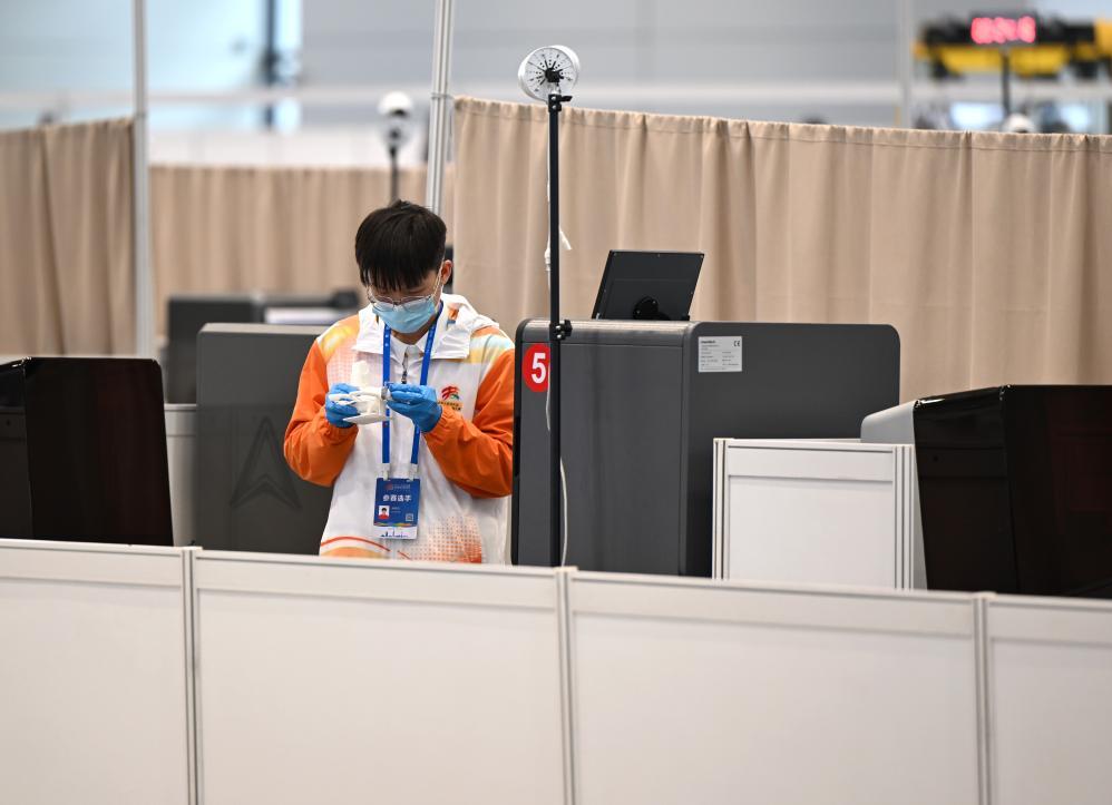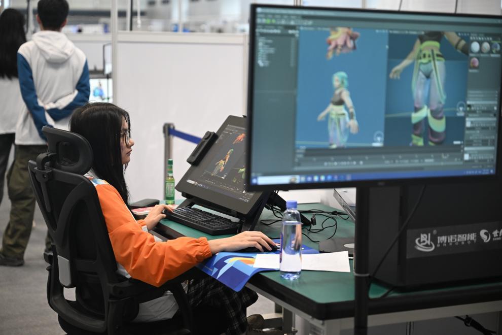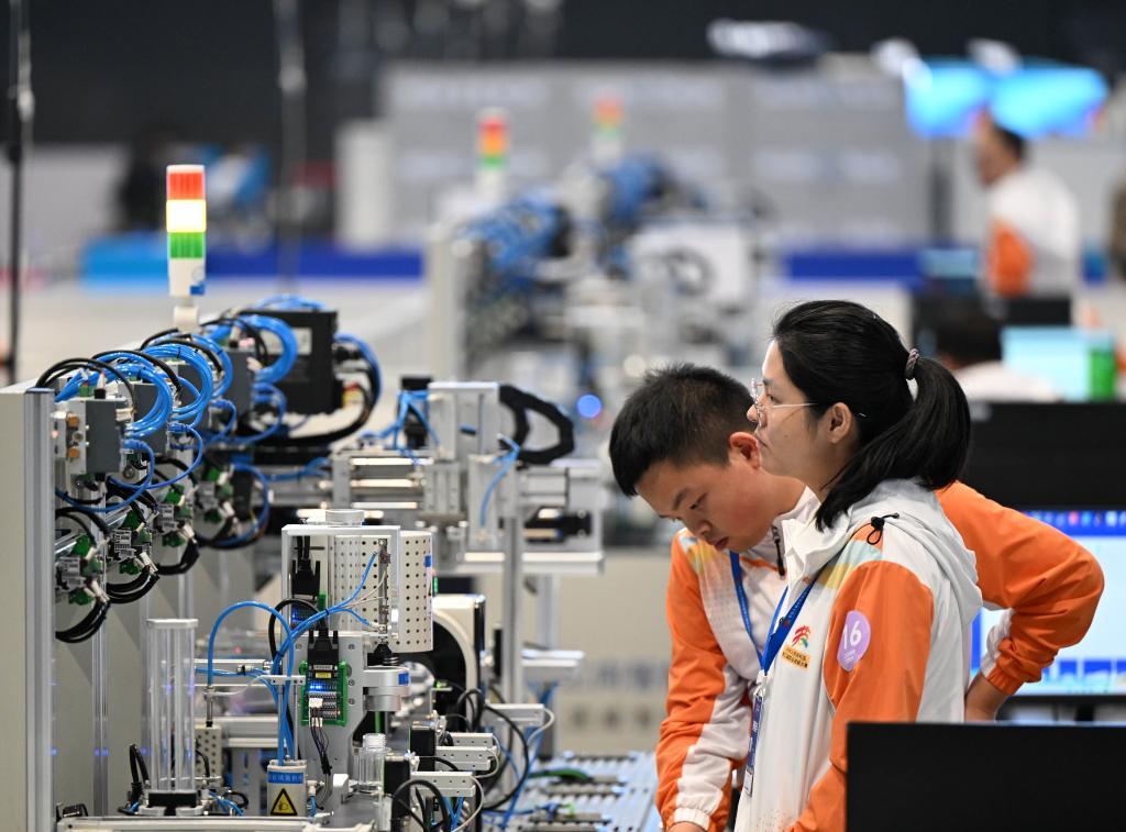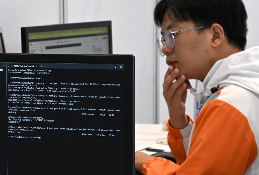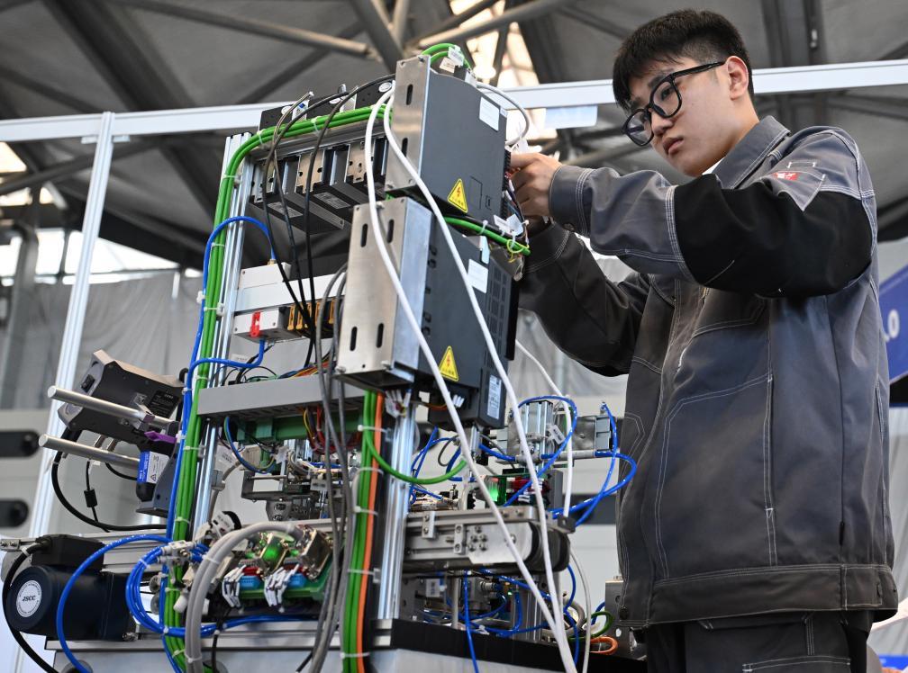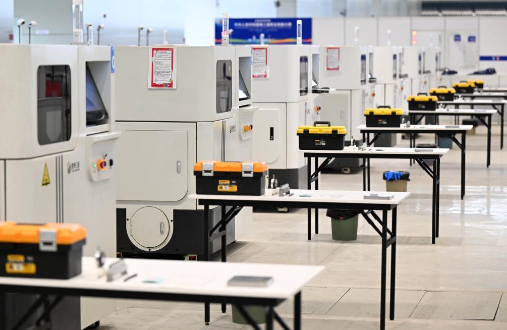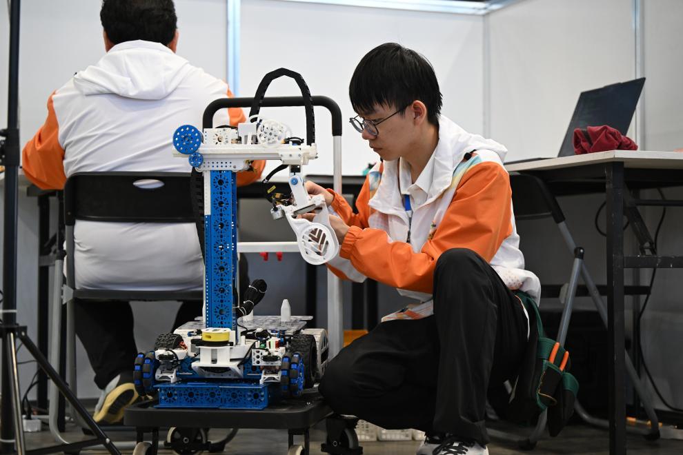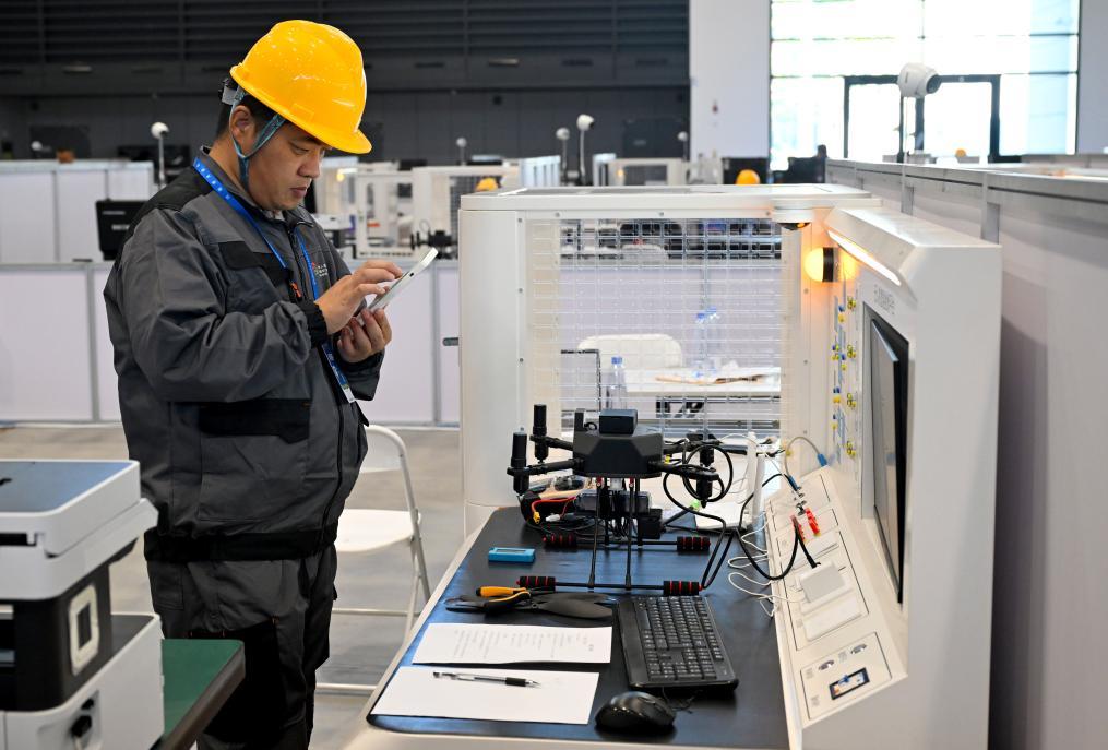工作人员在调试智能网联汽车装调运维项目比赛用车。