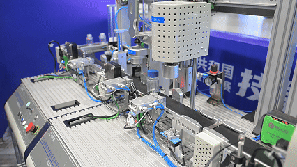 在工业互联网工程技术比赛项目展示区进行展示的模拟药品生产流水线。