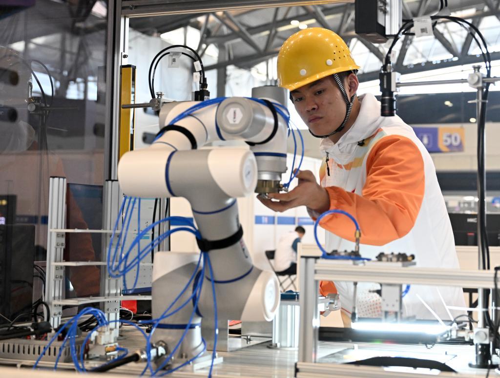 在第三届全国技能大赛广东省展演展示区,自主移动机器人在进行摘果操作演示。