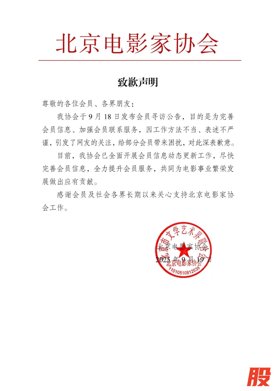 北京电影家协会就“公示失联名单”致歉:存在工作方法不当、表述不严谨的问题北京电影家协会就“公示失联名单”致歉:存在工作方法不当、表述不严谨的问题